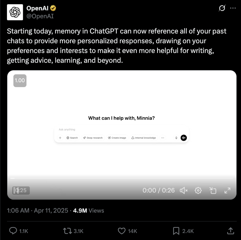 今年4月份,ChatGPT记忆功能上新,它可以支持参考过去所有对话内容,更好根据个人喜好来生成回复。