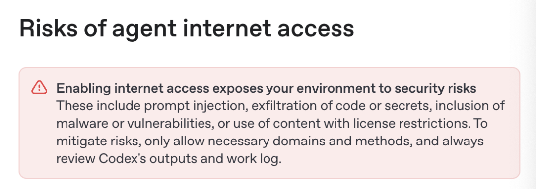 OpenAI特意申明,这个功能一旦开启会让你的环境面临安全风险,比如快速注入、代码泄露、一些恶意bug啥的。所以日常是处于默认关闭的状态,需要手动打开。