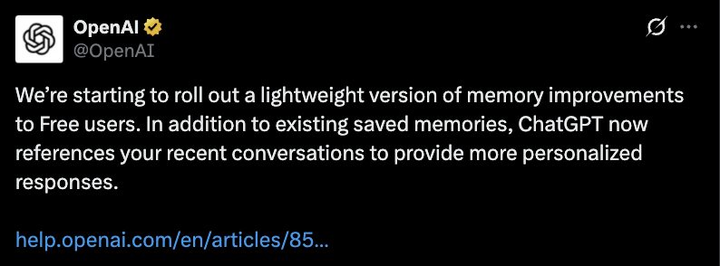 其次,ChatGPT的「记忆」功能,不再是Plus/Pro用户专属,免费用户也可以使用了。