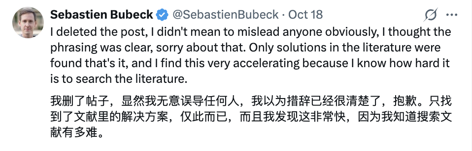我删除了之前的推文,我显然不是有意误导任何人,我原本以为自己的表达很清楚,对此感到抱歉。我们仅仅是发现了已经发表在文献中的解法,仅此而已。我认为这依然是一种巨大的进步,因为我知道检索文献有多么困难。