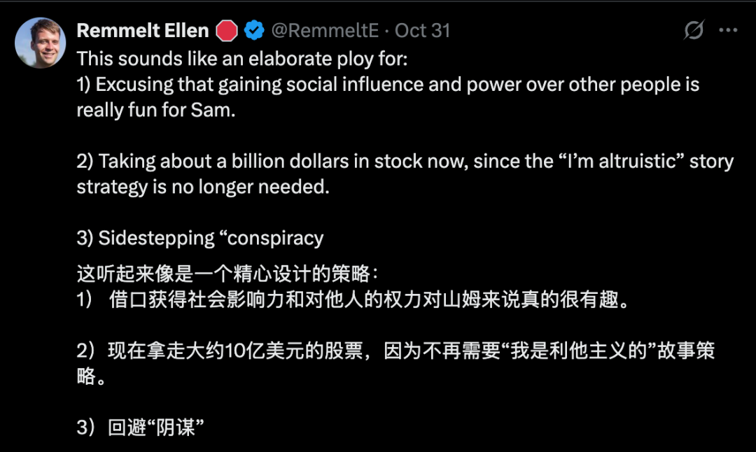所以或许对于奥特曼来说,成为一家万亿美元级的“非营利性”公司的CEO,要比凭借股份赚钱有吸引力得多。