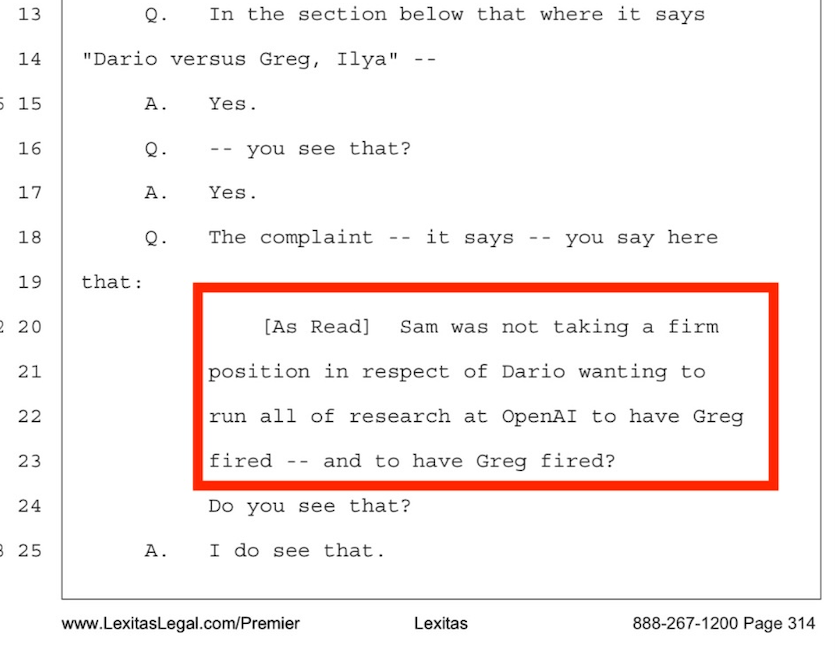 Dario曾希望接手OpenAI的所有研究工作,并解雇Greg Brockman (llya记录中Greg存在职场霸凌的行为),但奥特曼和Greg同气连枝,拒绝了他的请求,于是llya对此相当生气,以及在有关公司的运营方式上,奥特曼也经常自相矛盾。