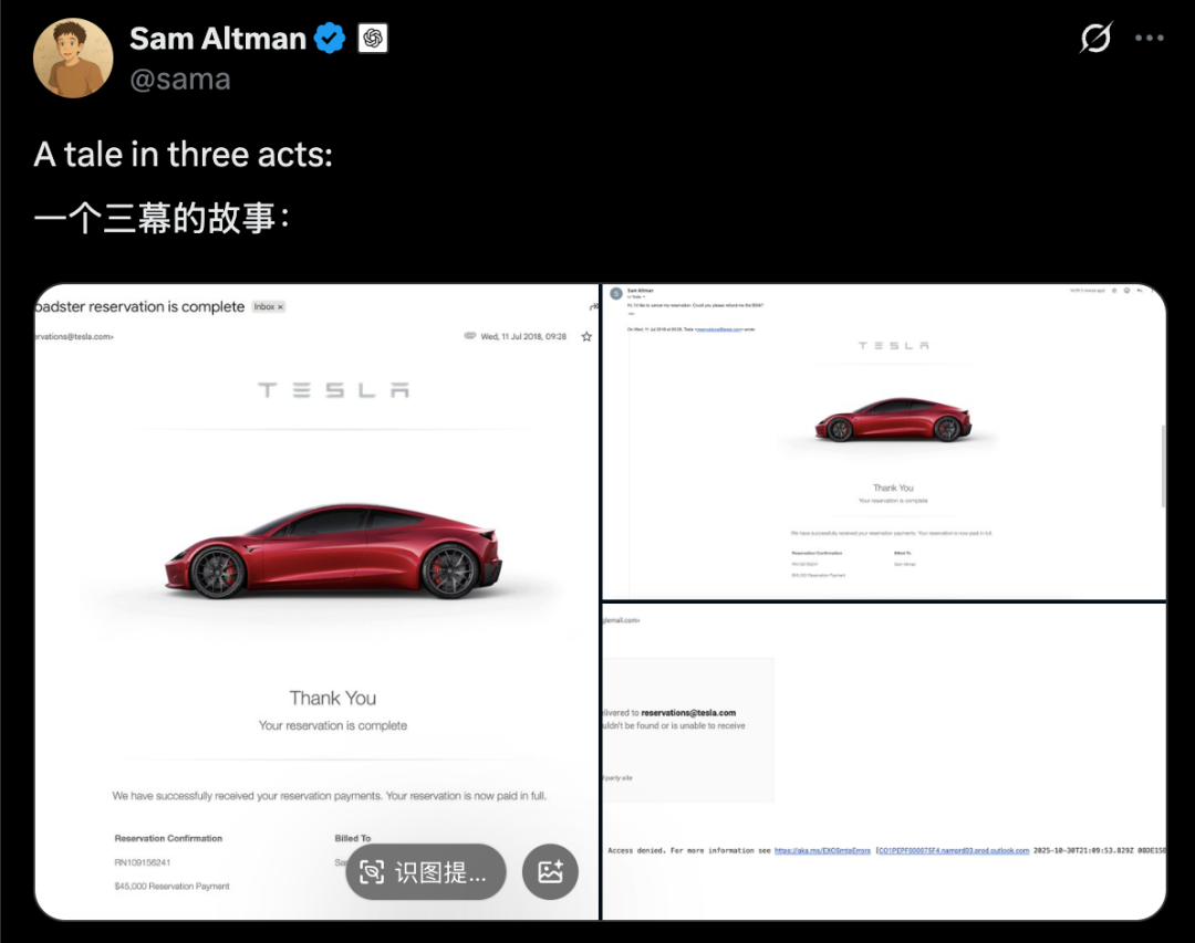 先是奥特曼晒出自己的特斯拉退款记录,七年前买的,至今还没收到货。