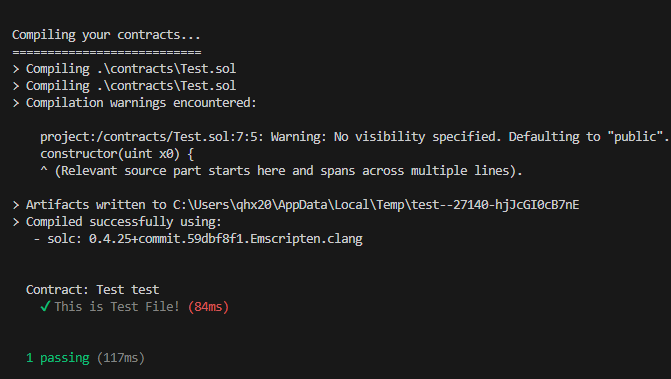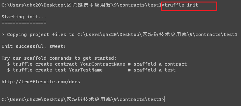 在truffle 控制台执行compile ,migrate 、test命令 会跟上文有同样的效果。