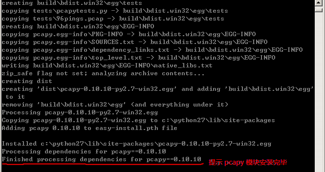 按上述方法处理后,再次运行命令 python setup.py install 即可完成 pcapy 模块安装。