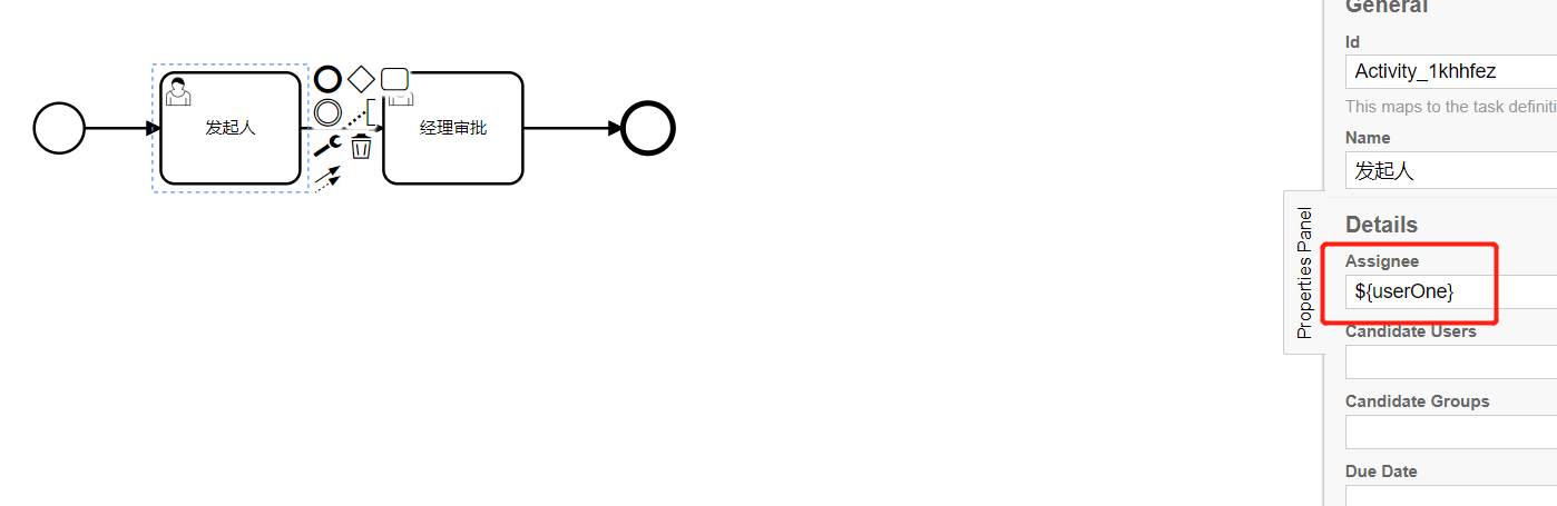 还是在Camunda Modeler中对发起人节点的任务代理人这里设置变量