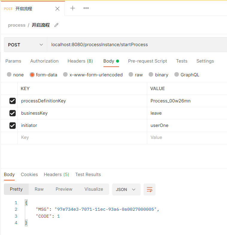 public ResultReturn startProcess(String processDefinitionKey,String businessKey,String initiator){