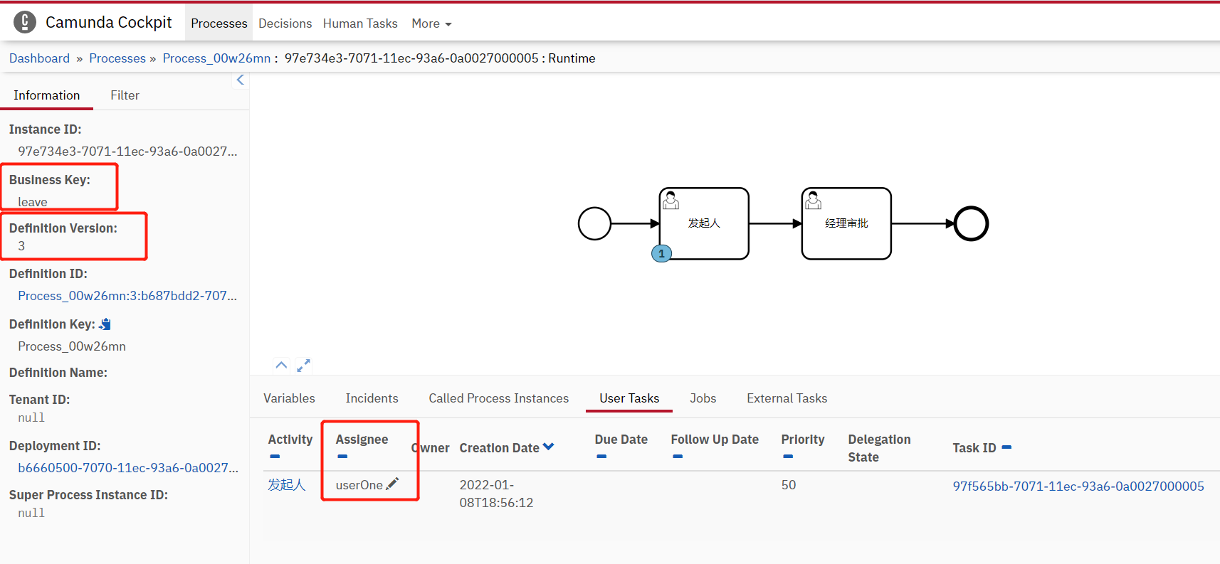 然后使用上篇提到的camunda view查看 有我们开启流程时设置的业务ID、流程定义版本号、当前节点的任务处理人