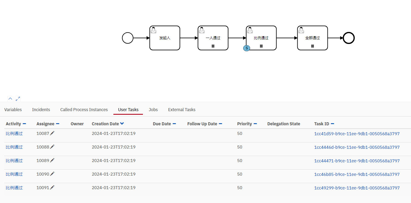<bpmn:userTask id="Activity_1hgbacv" name="比例通过" camunda:assignee="${assignee}">