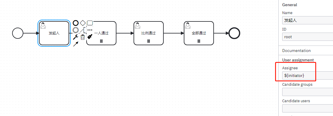 <bpmn:userTask id="root" name="发起人" camunda:assignee="${initiator}">