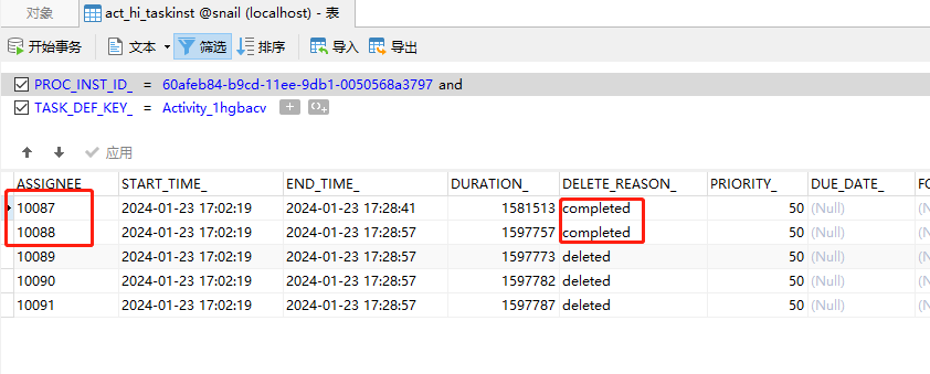 查看任务的历史表【act_hi_taskinst】,两个任务被完成,其他任务则被删除了。