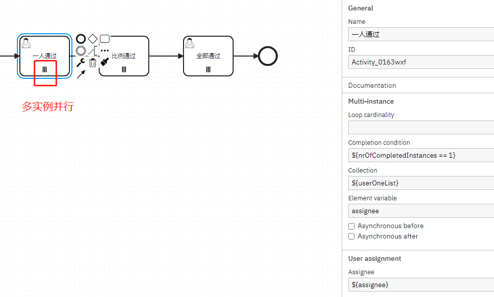<bpmn:userTask id="Activity_0163wxf" name="一人通过" camunda:assignee="${assignee}">
