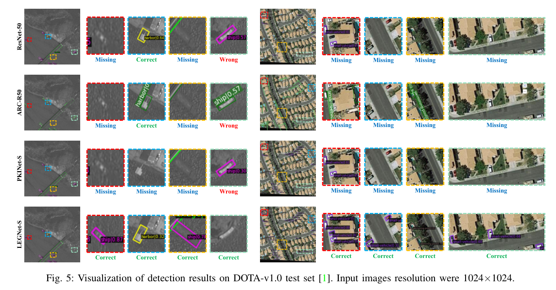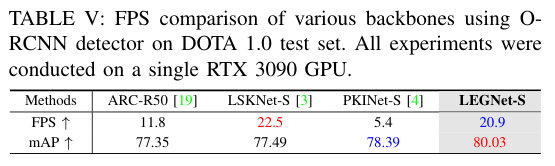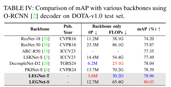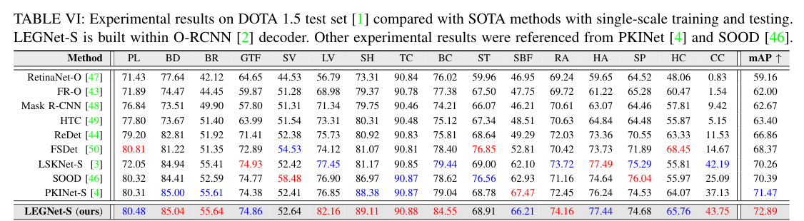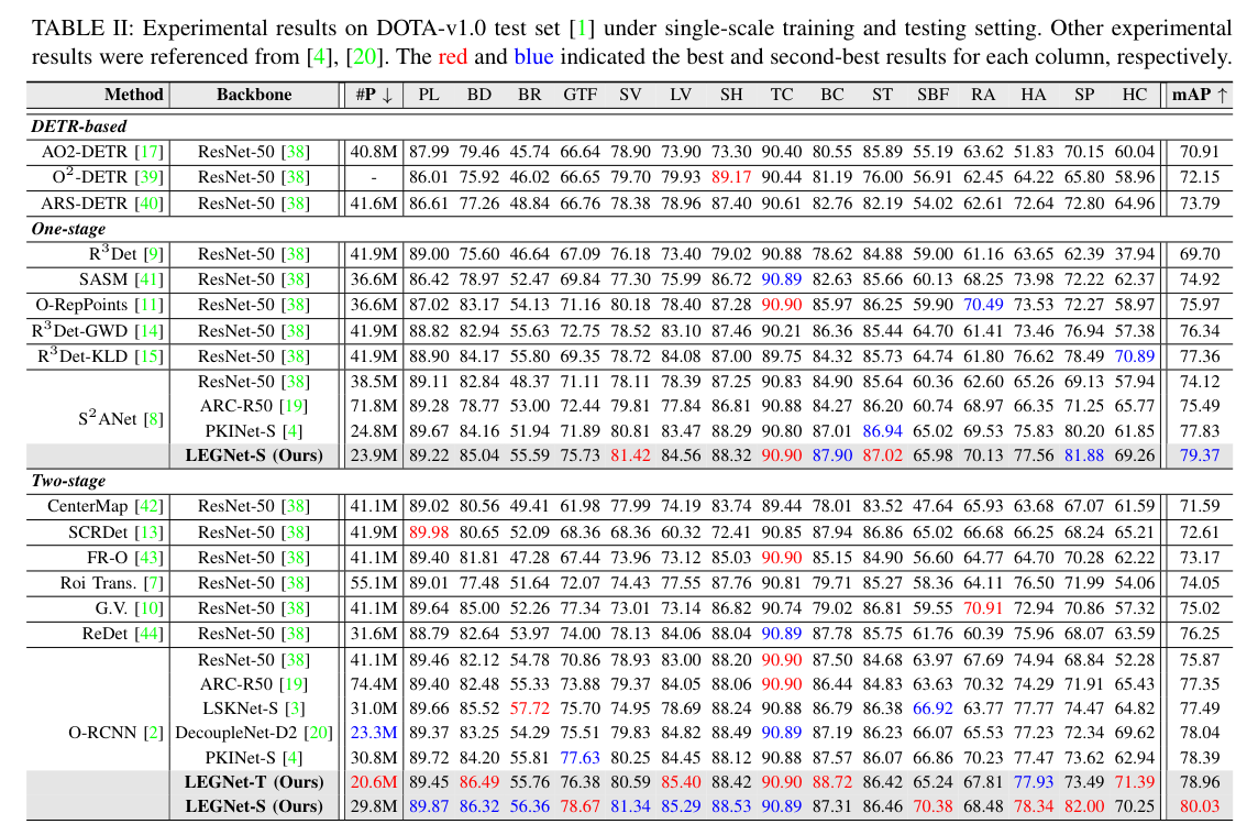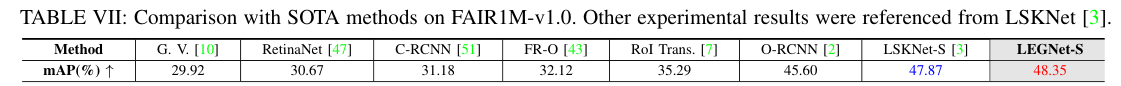 5)结果:在四个RSOD基准数据集(DOTA-v1.0、v1.5、DIOR-R、FAIR1M-v1.0)和一个无人机视角数据集(VisDrone2019)上的综合评估表明,LEGNet在性能上实现了显著提升,且在五个基准数据集上达到了最先进的性能。此外,LEGNet确保了计算效率,非常适合部署在资源受限的边缘设备上,适用于实际的遥感应用场景。代码:https://github.com/lwCVer/LEGNet