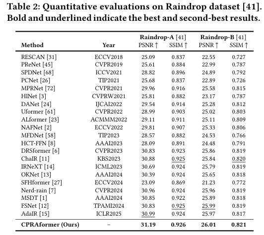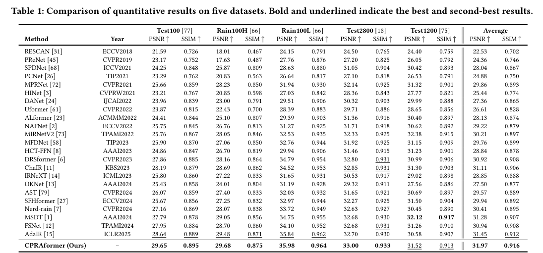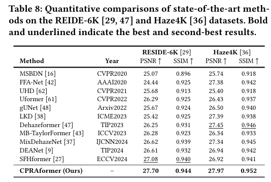 5)结果:大量实验表明,所提出的CPRAformer在八个基准数据集上达到了最先进的性能,并进一步验证了其在其他图像恢复任务及下游应用中的鲁棒性,展示了其在跨范式动态交互框架中的优势。