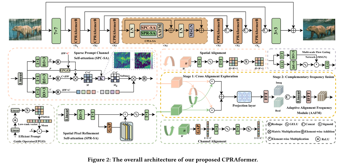 4)方法:为了解决这一问题,本文提出了CPRAformer,其核心思想是通过层次化表示和对齐,结合空间-通道和全局-局部两个范式的优势,促进图像的有效重建。具体方法包括:在Transformer模块中使用两种自注意力机制:稀疏提示通道自注意力(SPC-SA),增强全局通道依赖性,通过动态稀疏化来提升效果;空间像素精细化自注意力(SPR-SA),聚焦于空间雨迹分布和精细纹理恢复;引入自适应对齐频率模块(AAFM),通过两阶段渐进方式对特征进行对齐和交互,解决特征对齐和知识差异问题,实现自适应引导和互补。