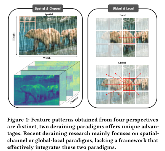 3)背景:尽管基于Transformer的网络在低级视觉任务中(如图像去雨)已取得显著成果,现有方法在面对不规则雨迹和复杂几何重叠时仍然面临挑战。单一范式架构难以有效整合全局-局部和空间-通道信息,因此需要一个统一的框架来克服这些困难。