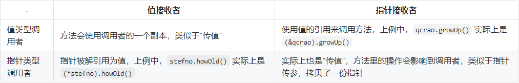 实际上,当类型和方法的接收者类型不同时,其实是编译器在背后做了一些工作,用一个表格来呈现: