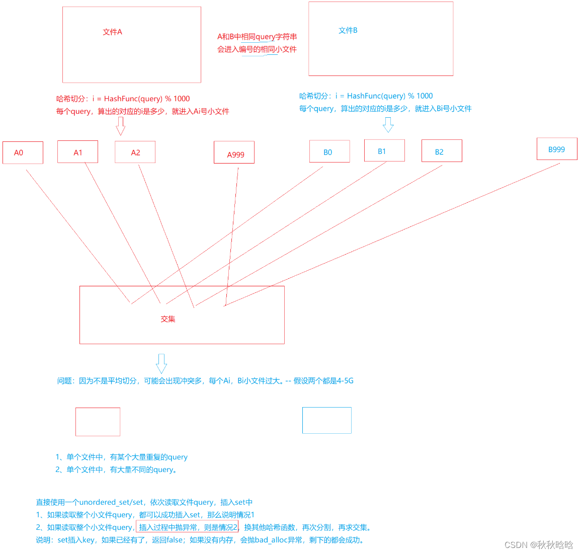 给两个文件,分别有100亿个query,我们只有1G内存,如何找到两个文件交集?分别给出精确算法和近似算法。