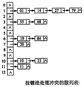 例如,关键字序列为{19,14,23,01,68,20,84,27,55,11,10,79},散列函数H(key)=key % 13,用拉链法处理冲突,建立的表如图所示。