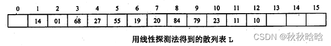 例如,关键字序列{19,14,23,01,68,20,84,27,55,11,10,79}按散列函数H(key) = key % 13和线性探测处理冲突构造所得的散列表L如图所示。