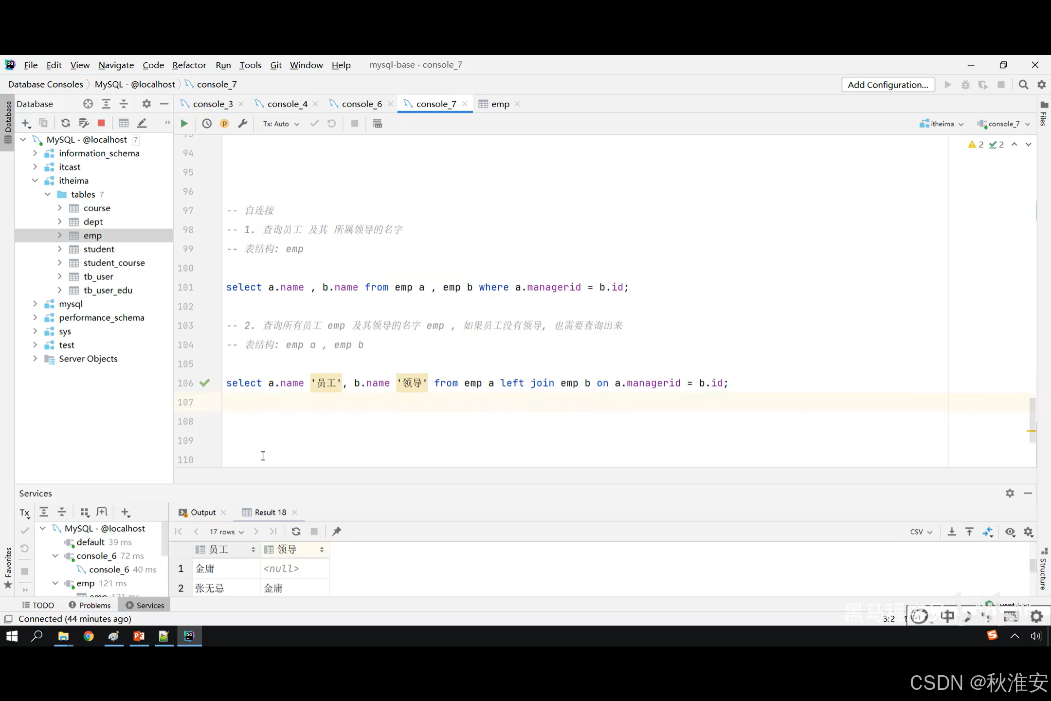 自连接:当前表与自身的连接查询,自连接必须使用表别名