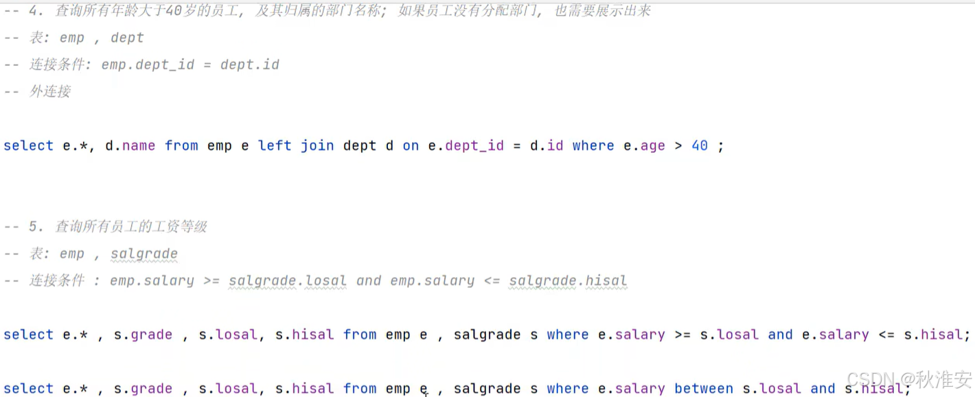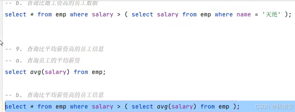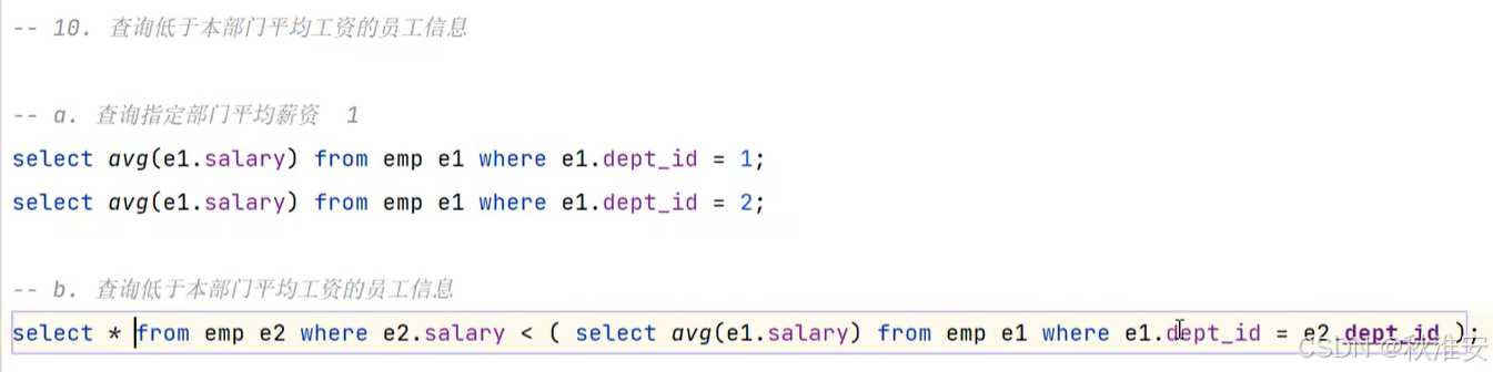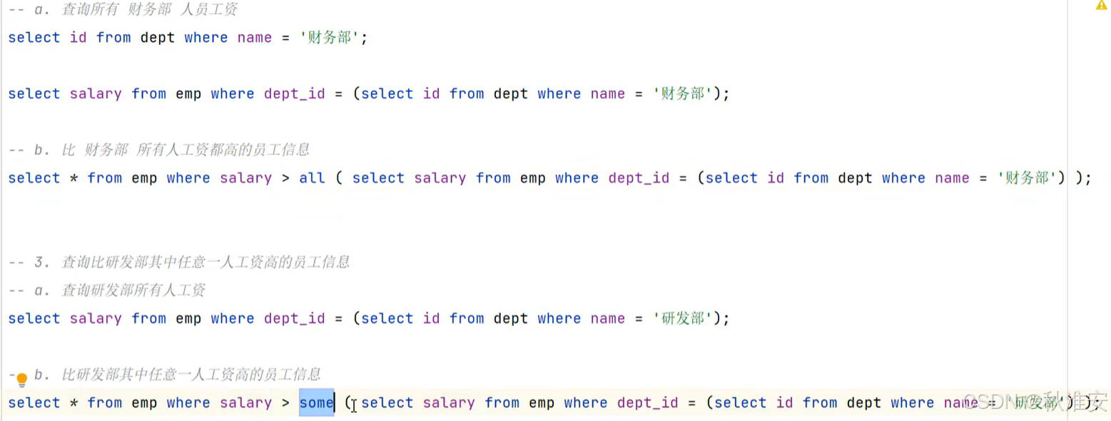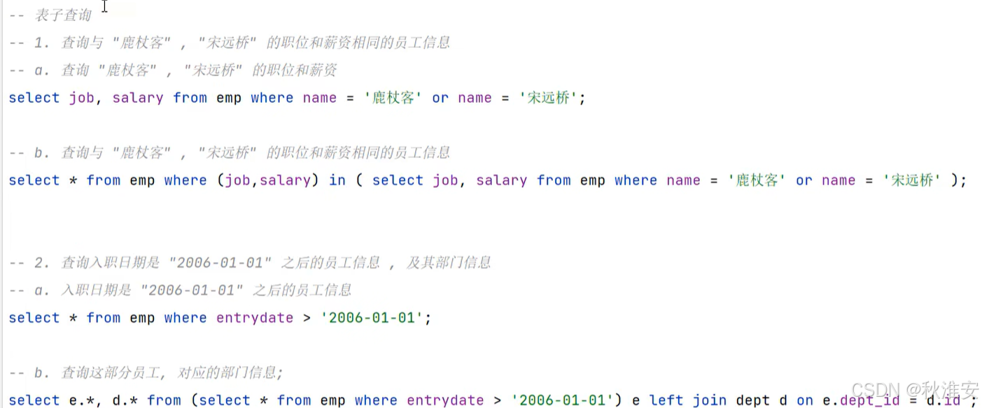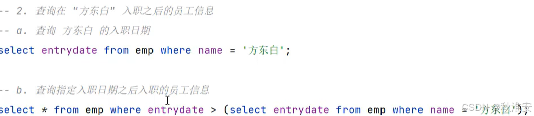 根据子查询位置,分为:WHERE之后、FROM之后、SELECT之后