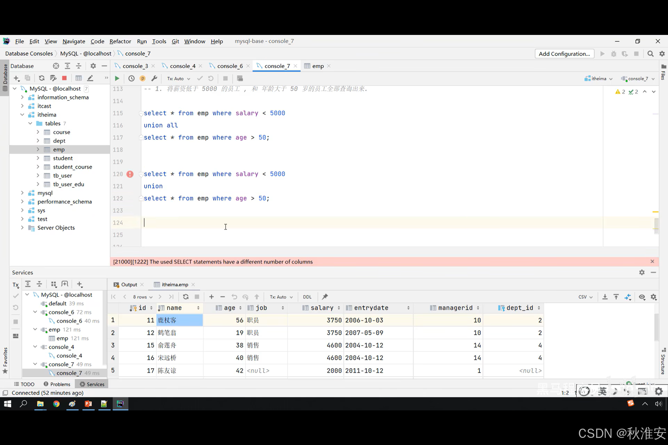 对于联合查询的多张表的列数必须保持一致,字段类型也需要保持一致