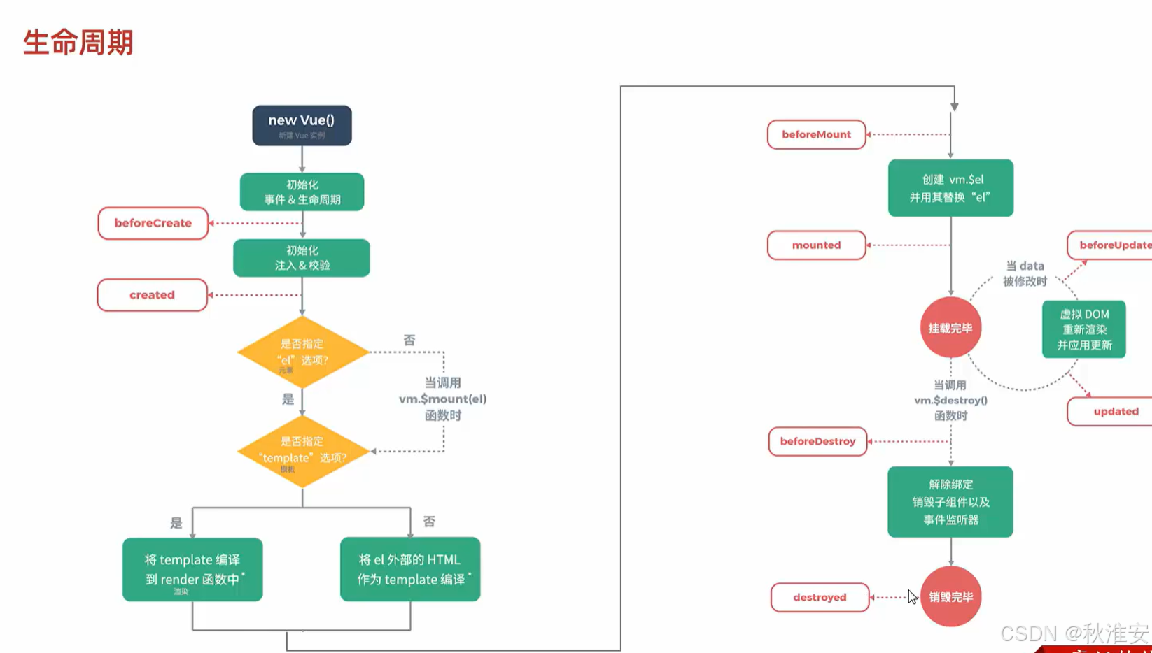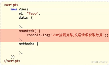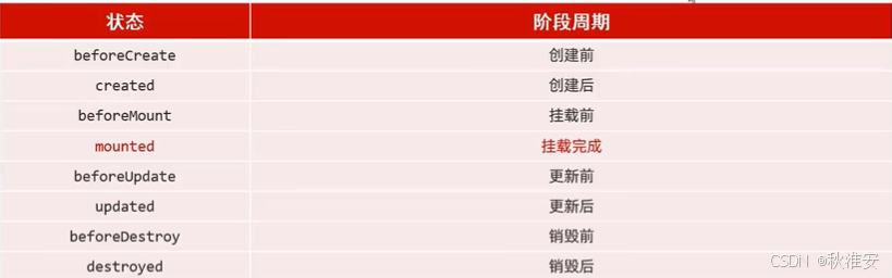 mounted:挂载完成,Vue初始化成功,HTML页面渲染成功(发送请求到服务端,加载数据)