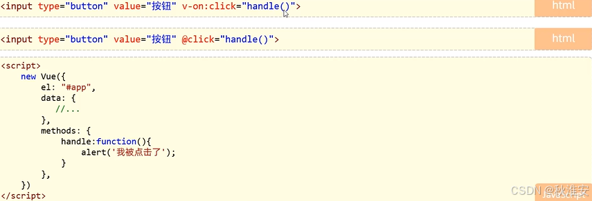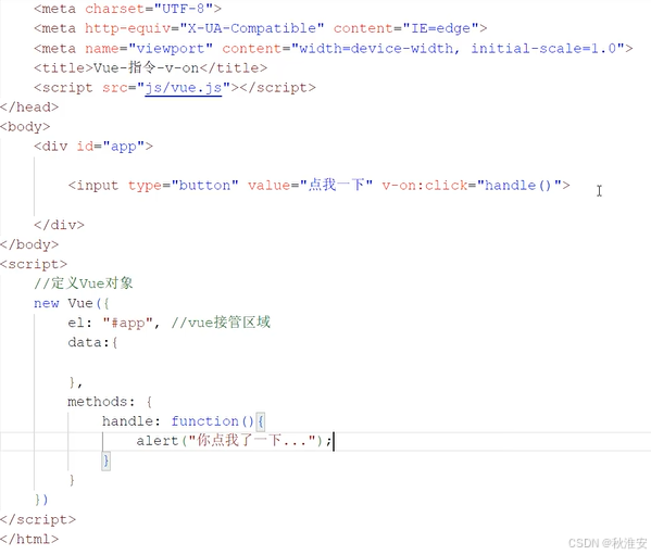 说明:click后面为调用函数,之后在Vue中定义handle方法,handle后定义一个函数function