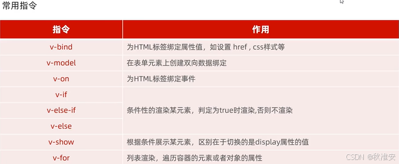 指令:HTML 标签上带有v-前缀 的特殊属性,不同指令具有不同含义。例如:v-if,v-for...