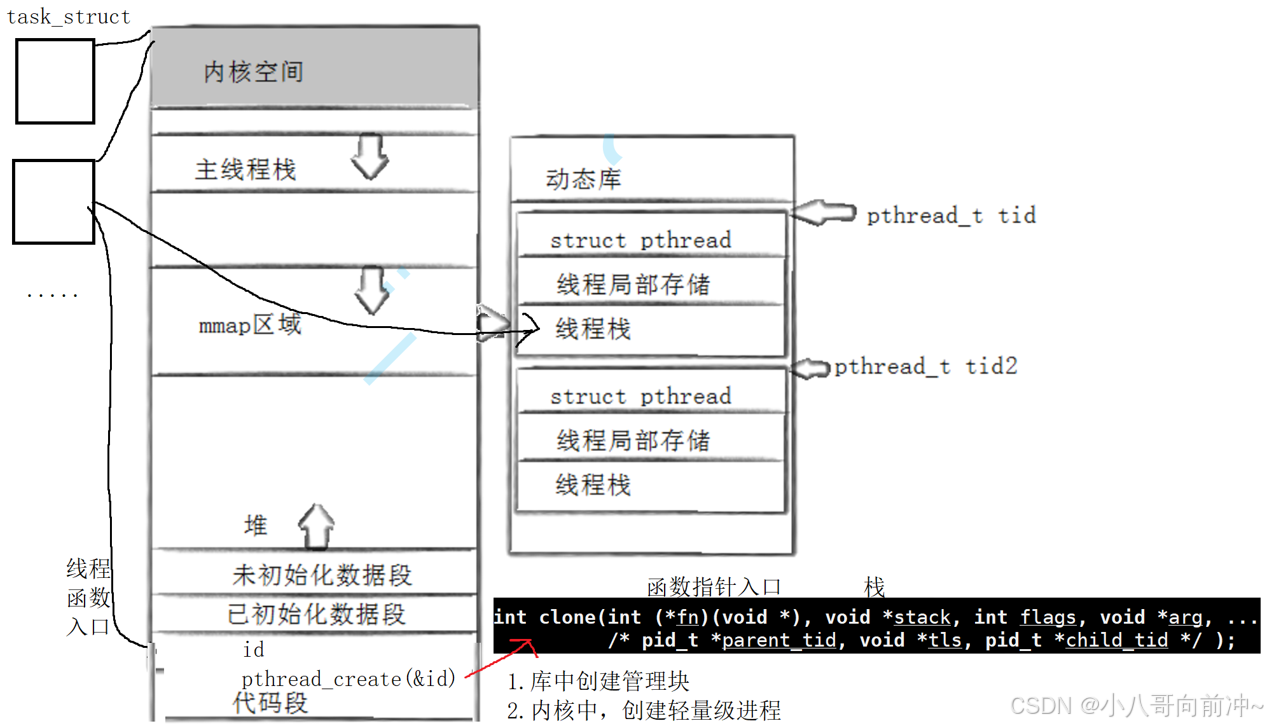2:在内核中,创建轻量级进程,创建对应的pcb,调用系统调用clone,会将线程函数入口,线程栈地址写入到pcb中,将来pcb调度这个线程,就会从这个函数入口开始执行,线程临时数据写入线程栈中。
