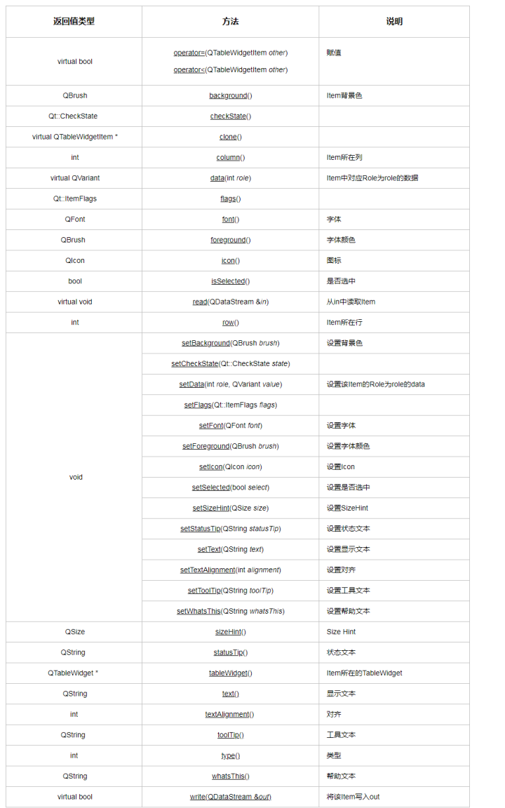 QTableWidgetItem指明QTableWidget中的一个Item。Item通常包含文本、图标、checkbox。