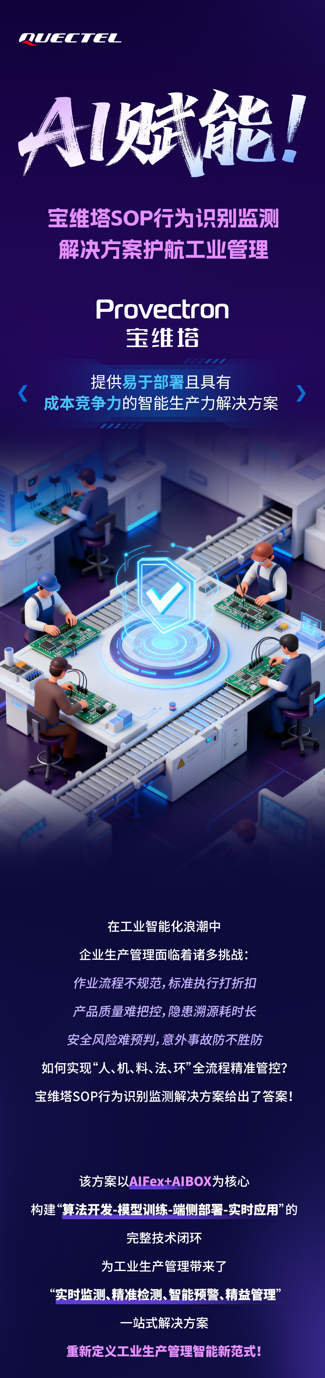 针对行业难题,移远通信旗下工业智能品牌宝维塔推出了SOP行为识别监测解决方案,该方案以AIFex+AIBOX为核心,依托自研全链路AI技术,可提供 “实时监测、精准检测、智能预警、精益管理” 的一站式解决方案,助力企业突破生产管理瓶颈,迈入高效、安全、智能的发展新阶段。
