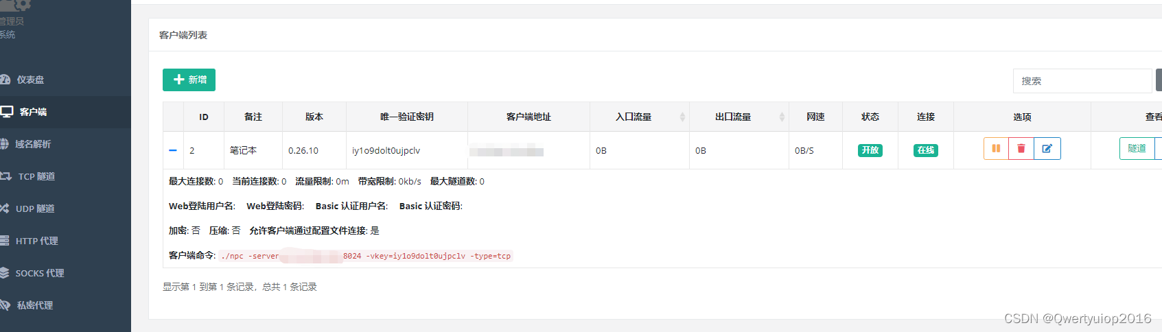 接着就可以通过ip:端口访问nps的登录界面了,在客户端界面添加一个,备注改一下,其他都可以默认