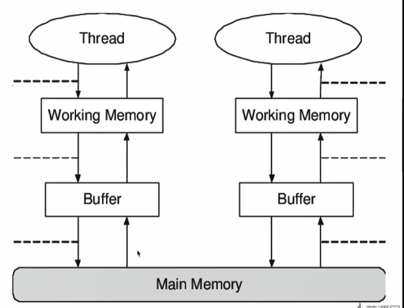 线程工作在WorkingMemory中,他不与主内存直接沟通,而是通过Buffer缓冲区与主内存进行同步,线程间的交互最终也就是通过主内存实现的;