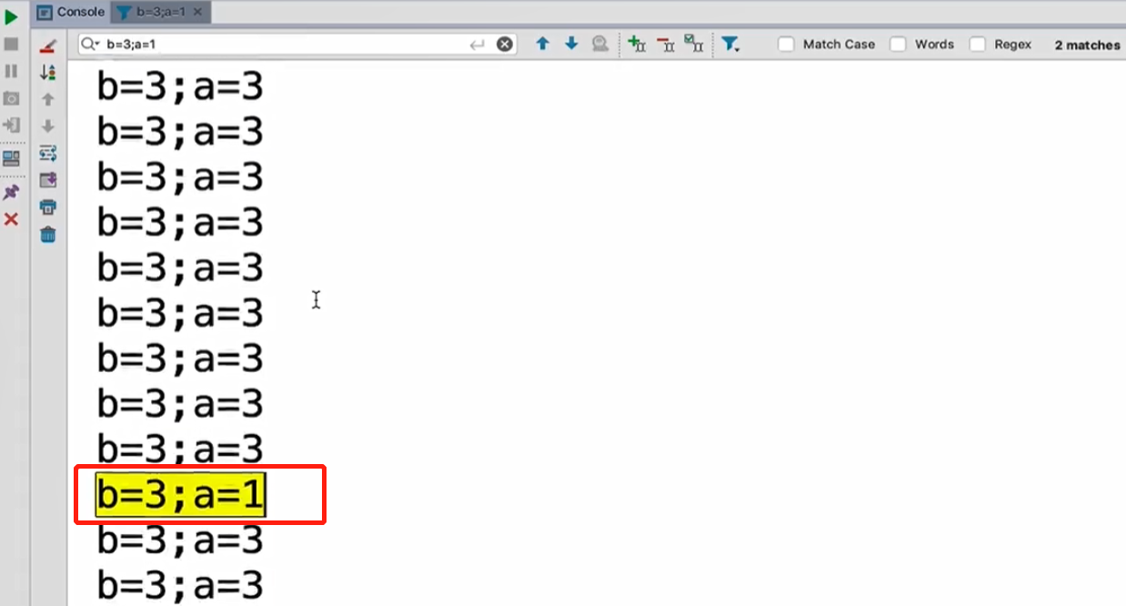 b=a;System.out.println("b:"+b+",a:"+a);a=3; 最终结果是 b:1,a:1 // 这个是指令重排序的结果,几率比较低,这里不做考虑