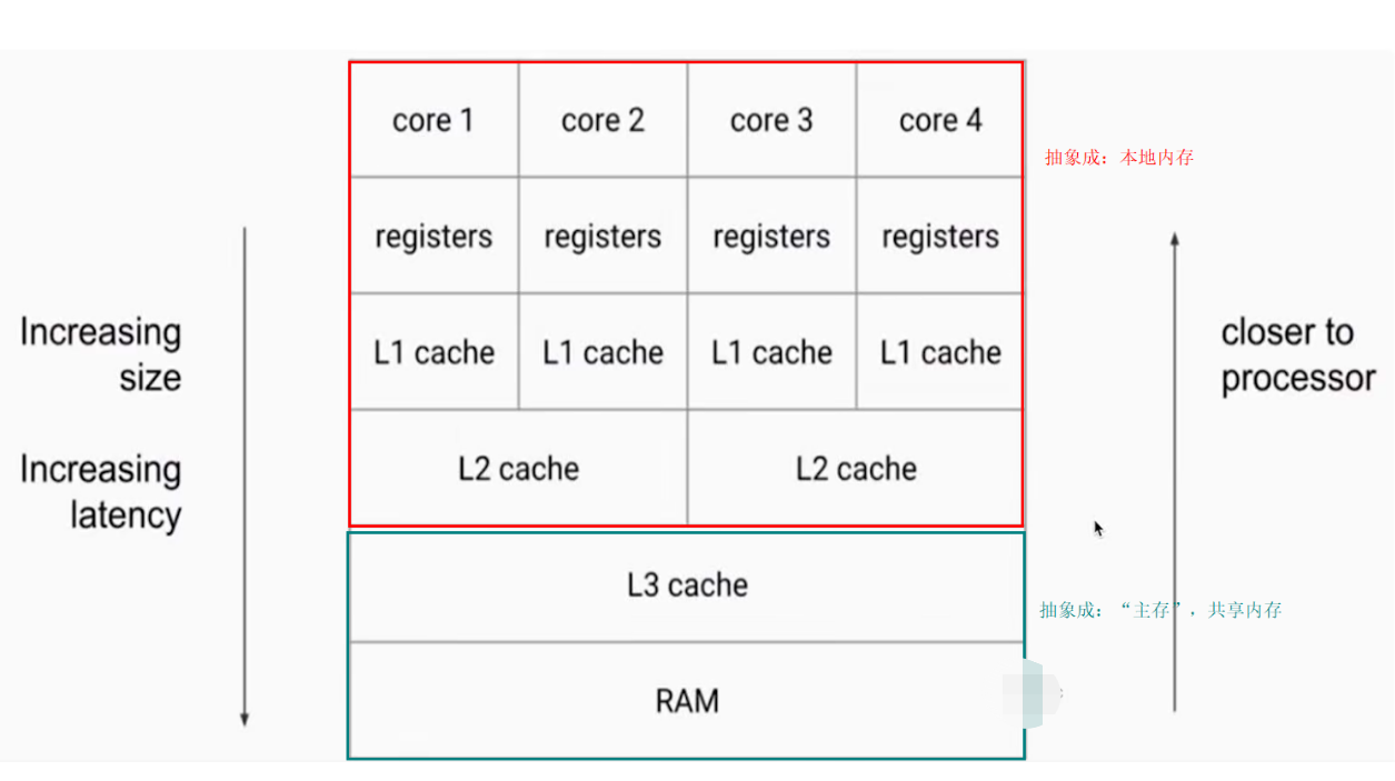 Java 作为高级语言,屏蔽了这些底层细节,用JMM 定义了一套读写内存数据的规范,虽然我们不再需要关心一级缓存和二级缓存的问题,但是,JMM 抽象了主内存和本地内存的概念,这里说的本地内存并不是真的是一块给每个线程分配的内存,而是对于寄存器、一级缓存、二级缓存等的抽象。