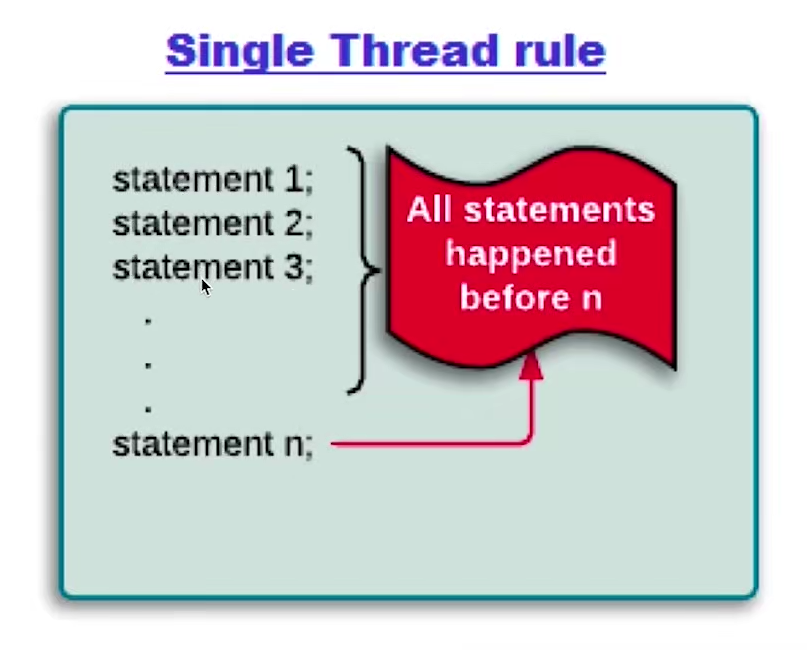 - 单线程原则:若是单线程执行,那么后面执行的语句肯定能看到前面执行的语句做了的行为结果,这里的前后是指执行顺序,不是java文件的代码顺序,因为文件中的代码顺序有可能被重排序打乱。