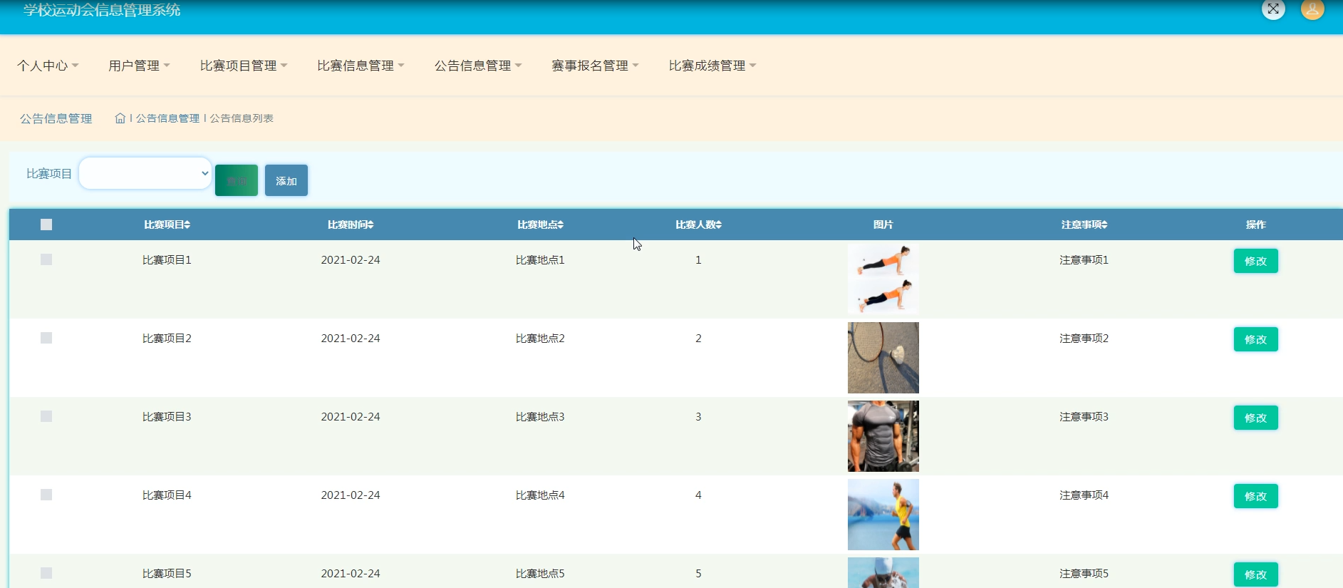 项目管理模块:维护运动会比赛项目信息(如 100 米跑、跳远、接力赛等),区分个人项目与集体项目,设置项目参赛人数限制、分组规则及录取名次,支持项目增删改查。
