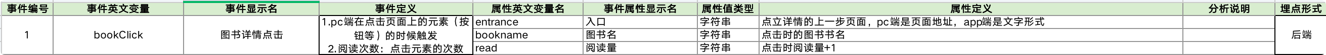 1 | bookClick | 图书详情点击 | 1.pc端在点击页面上的元素(按钮等)的时候触发 2.阅读次数:点击元素的次数 3.触发用户数:点击元素的用户 4.触发的内容:点击的图书名称 5.触发路径位置:从哪个页面触发 |