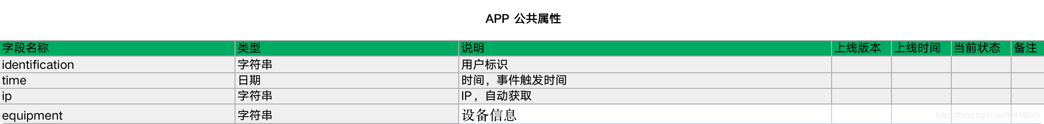 字段名称 | 类型 | 说明 | 上线版本 | 上线时间 | 备注 |