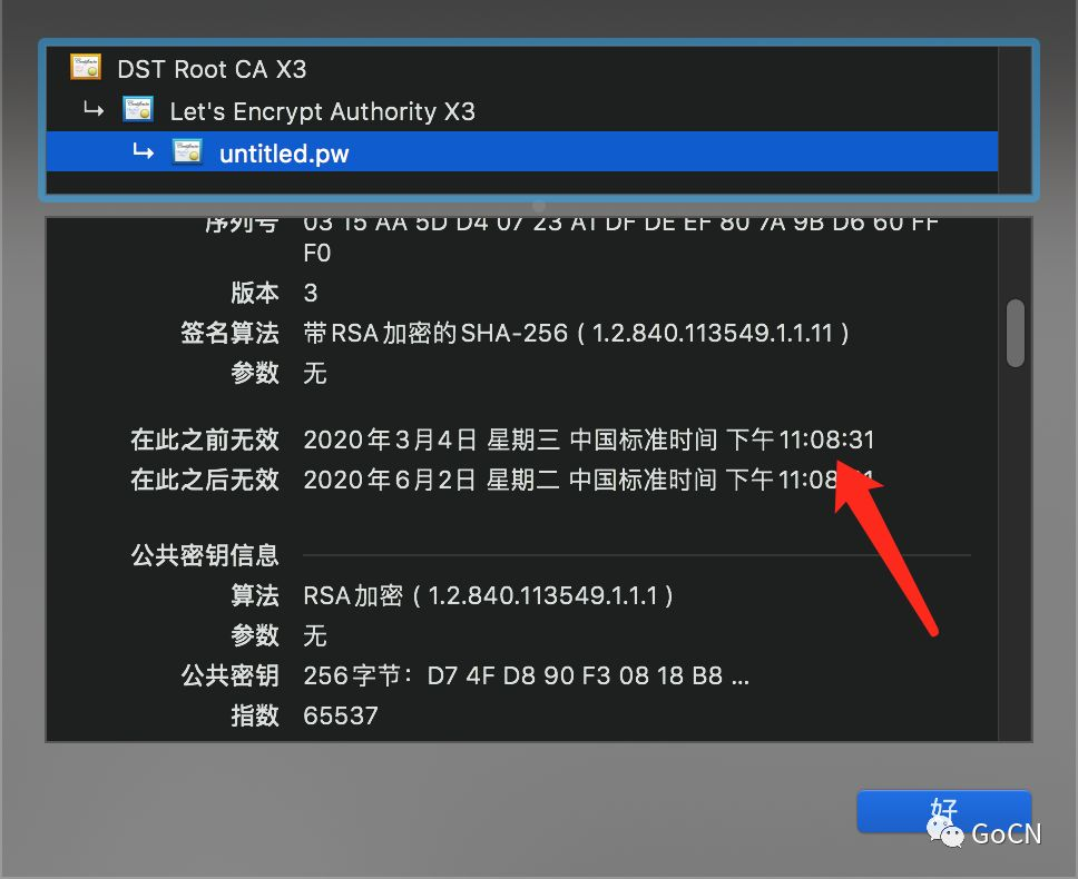 根据官方描述,此次受到影响的域名签发日期在 2019-12-04 到 2020-02-29 之间。你可以在浏览器中点击域名左边的小锁图标来查看签发时间: