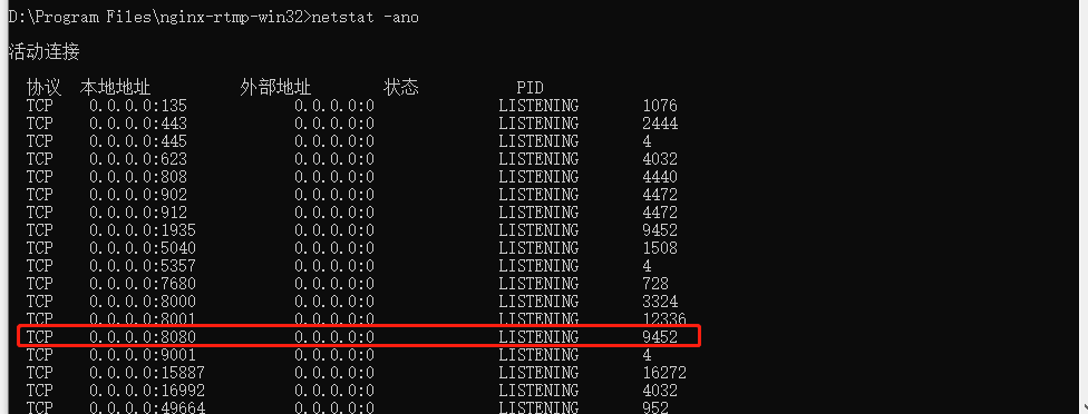 3.使用netstat -ano 查看端口监听命令,可以看到nginx的8080端口仍然存在,可以看到nginx监听端口的pid存在