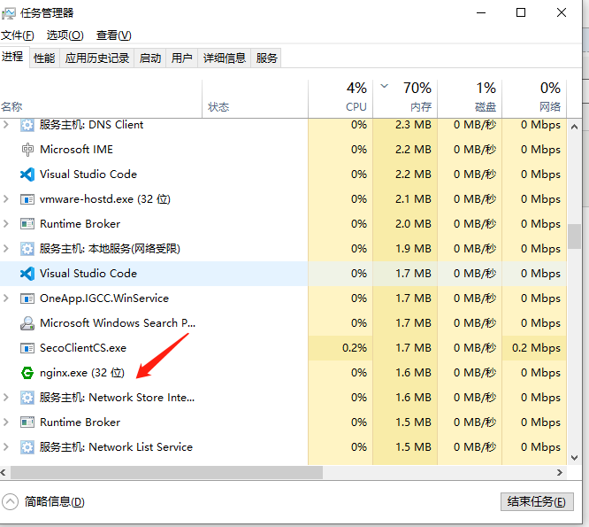 1.使用右键选中nginx进程,结束进程后,一会儿又出来了,重复多次无效,且页面依旧可以访问