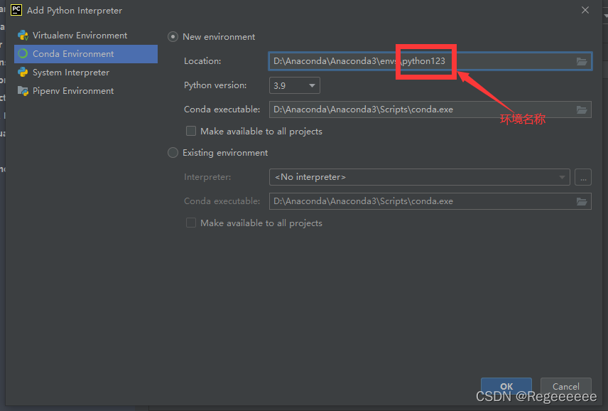 ——选择Conda Enviroment——选择New enviroment——在Python version下拉按钮中选择对应的python版本号