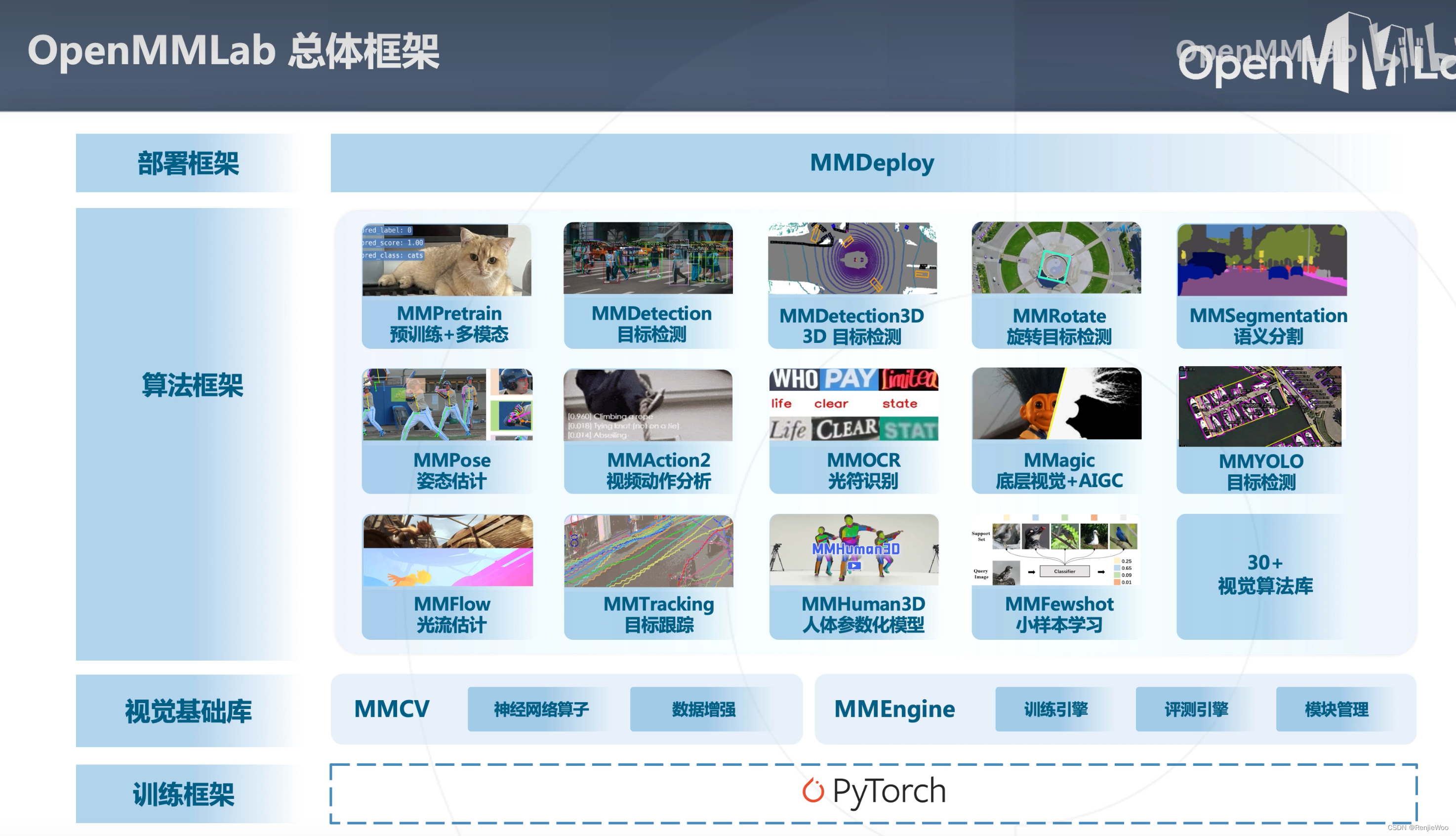 对于研究者的帮助因人而异,对于我,我更喜欢自己研读代码,然后复现模型,在不断的调试中真正吃透算法。当然,对于时间非常紧迫的任务,使用开源且预训练好的OpenMMLab对项目的帮助无疑也是巨大的。同样,囊括迄今各大经典算法框架,降低了用于使用难度,且支持部署多平台,增加用户粘性。OpenMMLab对于工业的帮助无疑是巨大的,工业使用的成本大大降低了。如下图视觉基础库,OpenMMLab志在覆盖AI模型全部流程。希望我可以保持初心,并借鉴OpenMMLab算法实现的精华。CV算法全家桶,生态圈。