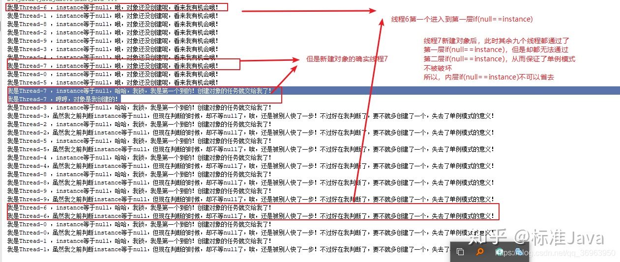 对运行结果的解释:虽然线程6先进入的第一个if (_sSingleObject == null) ,但创建对象的确实线程7,而此时,线程6已经判断了instance==null,所以他还会再创建一个对象,因为并没有人告诉线程6,线程7已经创建过对象了,而内部的这个if (_sSingleObject == null) ,就是为了告诉别人,对象我已经创建过了!其他人就不要再创建了!
