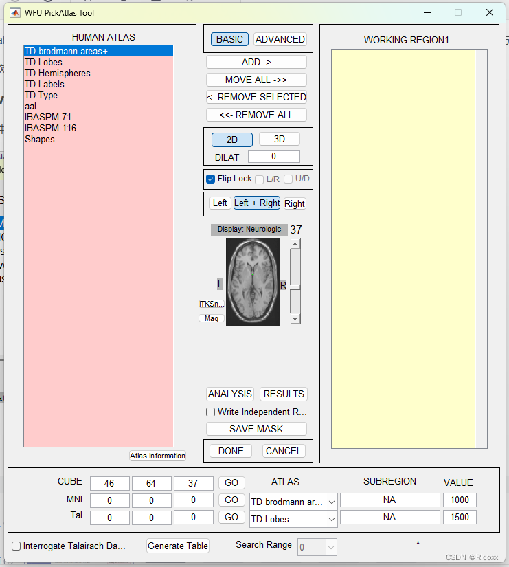 在计算数据之前,需要去掉小脑区域,因此需要制作一个自定义的mask文件,使用wfu-pickatlas包方便挑选ROI。