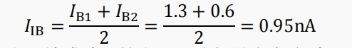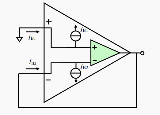 理解:运放的两个输入端并不是绝对高阻的,本项指标主要描述输入端流进电流的数量级。比如某个运放在接成跟随器且正输入端接地情况下,正输入端存在流进电流 1.3nA,即下图IB1=1.3nA,负输入端存在流进电流 0.6nA,即图 2-2 中 IB2=0.6nA,那么该运放的输入偏置电流 IIB即为0.95nA。