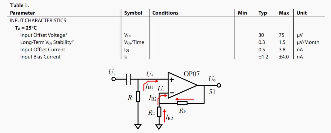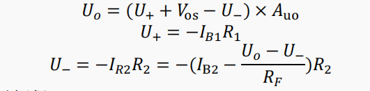 放大电路的输入电压为 0 时,导致输出不为 0 的原因一般有三个,输入失调电压VOS,输入偏置电流 IB,输入失调电流 IOS,其中后两个的影响依赖于放大电路外部的电阻。